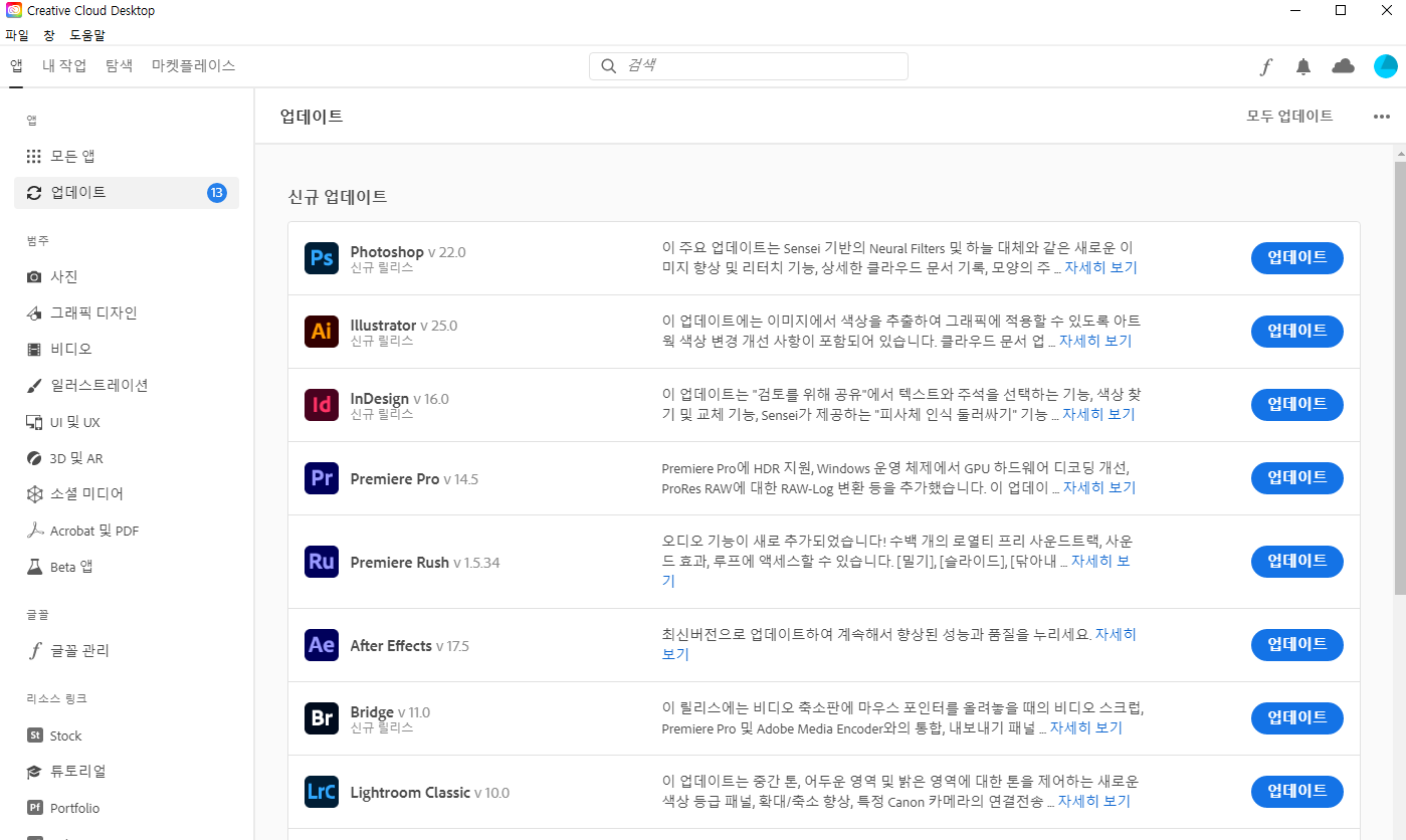 현재 설치되어 있는 Adobe 앱 버전을 확인하고 최신 버전으로 업데이트 하는 방법은 아래와 같습니다.