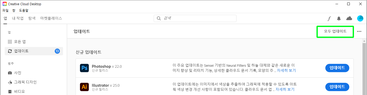 4. 업데이트를 진행하려는 Adobe 앱을 [업데이트] 메뉴를 이용하여 진행합니다.